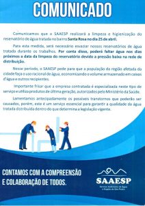 Comunicamos que o SAAESP realizará a Limpeza e Higienização do Reservatório de água tratada no bairro Santa Rosa no dia 25 de abril.