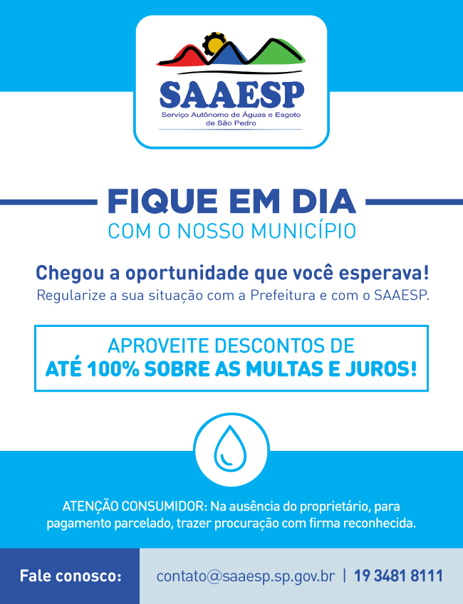 Aprovado projeto Lei nº 47, onde o SAAESP fará parte, por tempo limitado, do Programa de Recuperação Fiscal – REFIS, garantindo que a população consiga efetuar os pagamentos de seus débitos com parcelamentos e descontos de até 100% sobre os juros e multas.