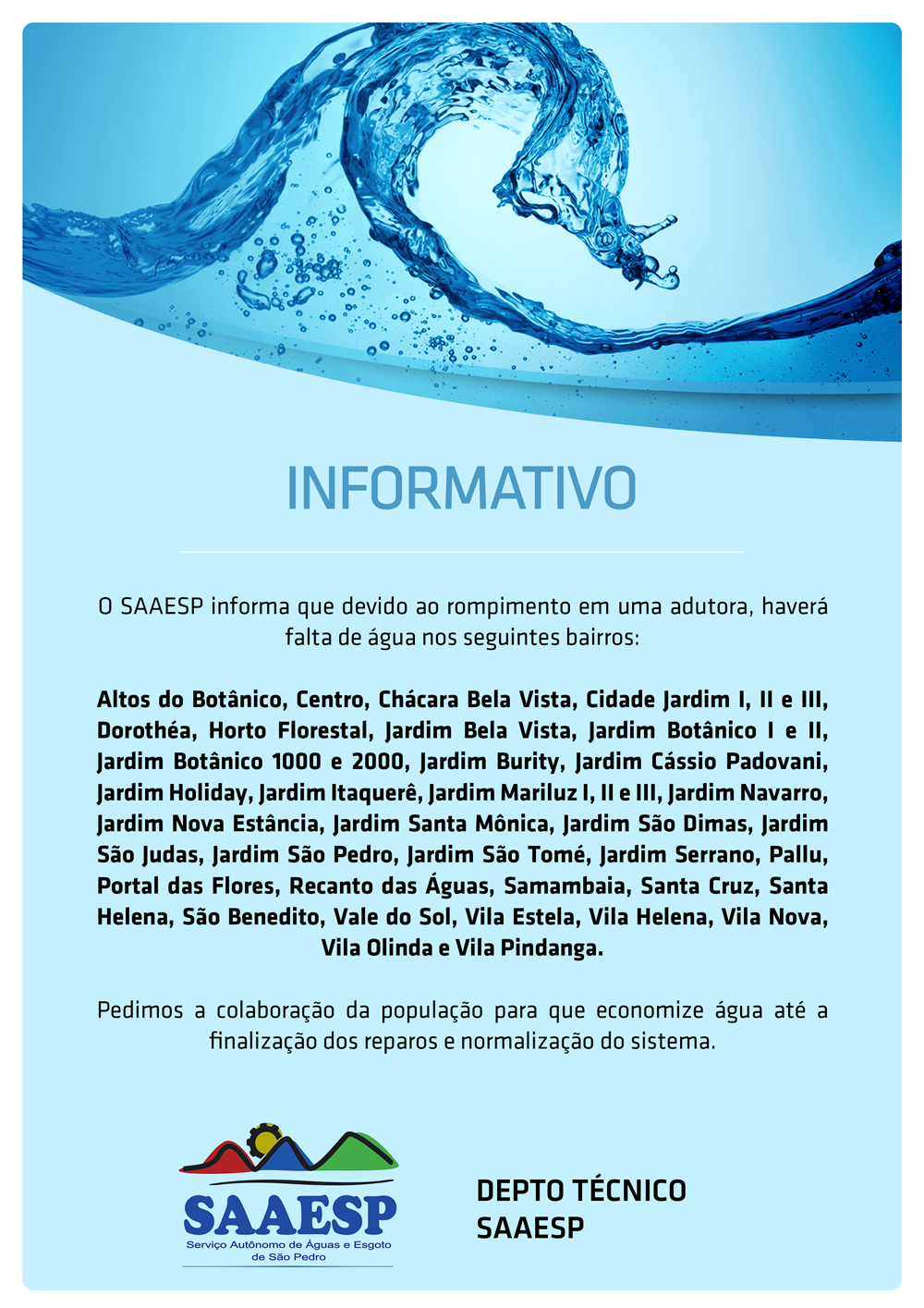 Prezado (a) Cliente, O SAAESP na busca da melhoria contínua nos serviços prestados e na qualidade da água fornecida a …