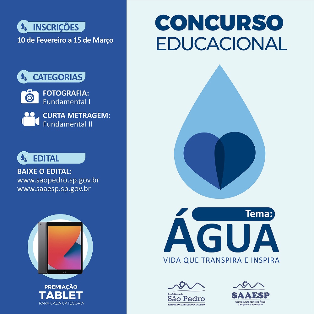 “Água, vida que transpira e inspira” é o tema do Concurso de Fotografia e Curta-Metragem promovido pelo Saaesp (Serviço Autônomo de Água e Esgoto de São Pedro) em parceria com a Secretaria Municipal de Educação para incentivar a arte e promover o uso consciente da água.