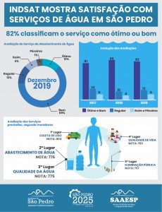 O Serviço Autônomo de Água e Esgoto de São Pedro foi avaliado pelo Indsat – Indicador de Satisfação de Serviço Público – conquistando dois dos três primeiros lugares no ranking municipal. O abastecimento de água ficou em 2º lugar, com 776 pontos, seguido da qualidade da água, com 775, ambos com alto grau de satisfação.